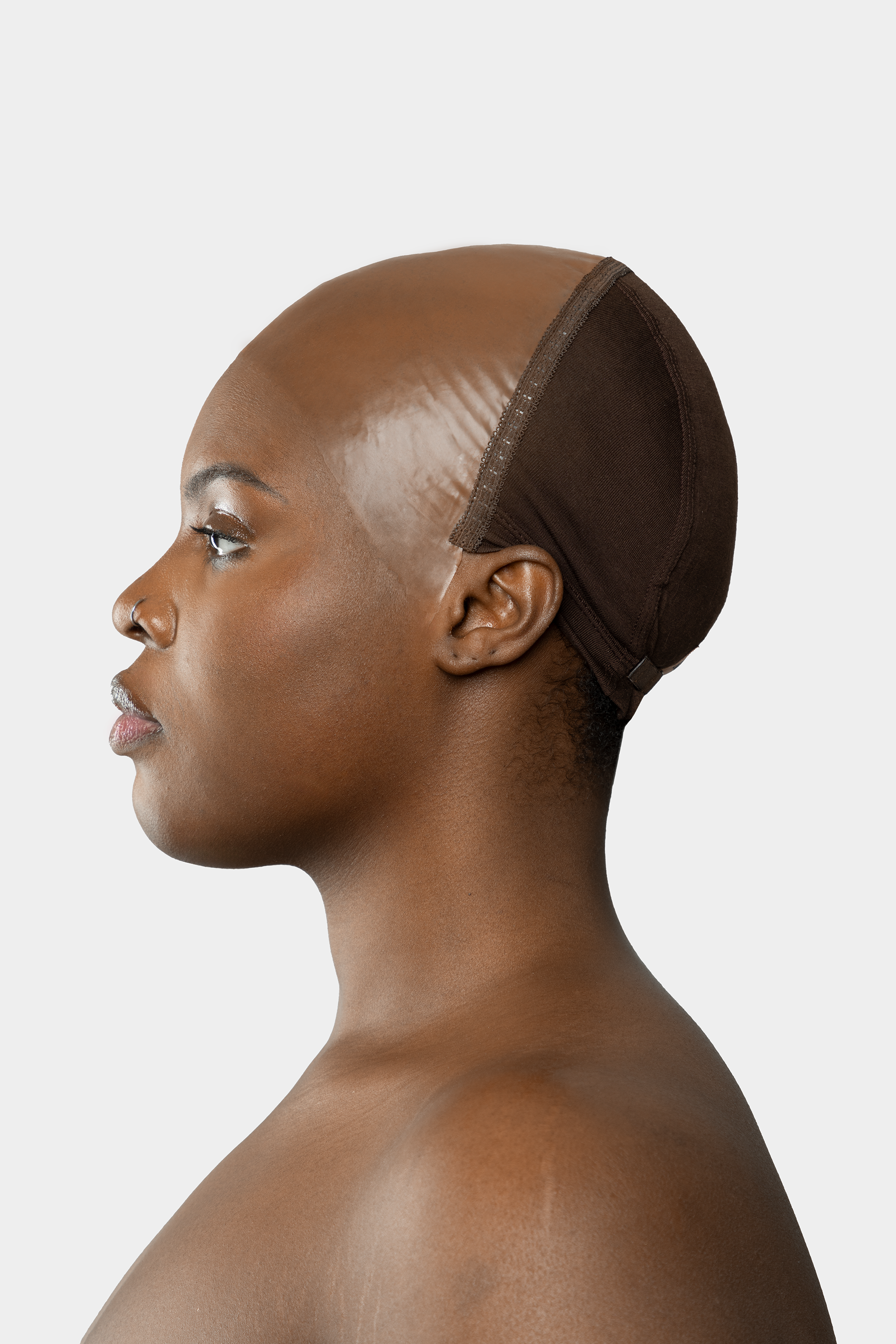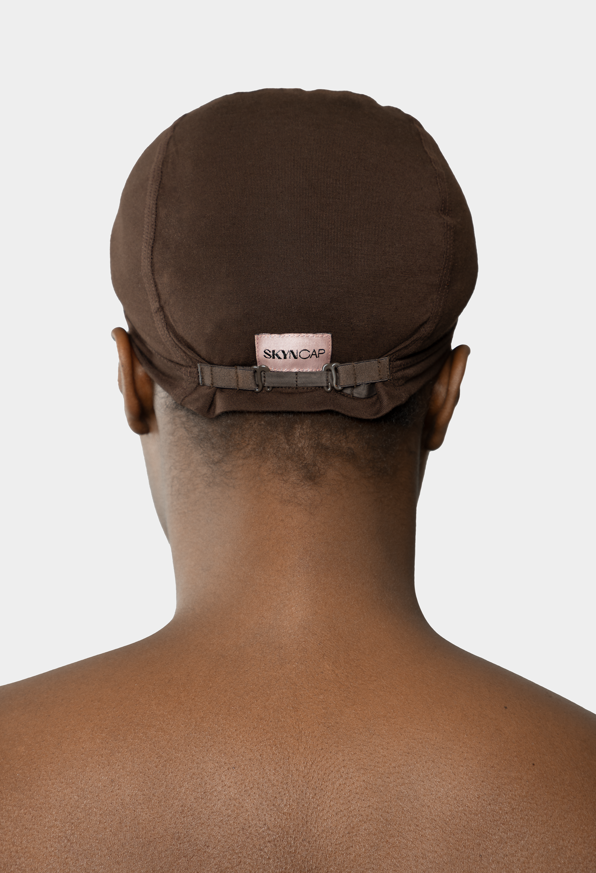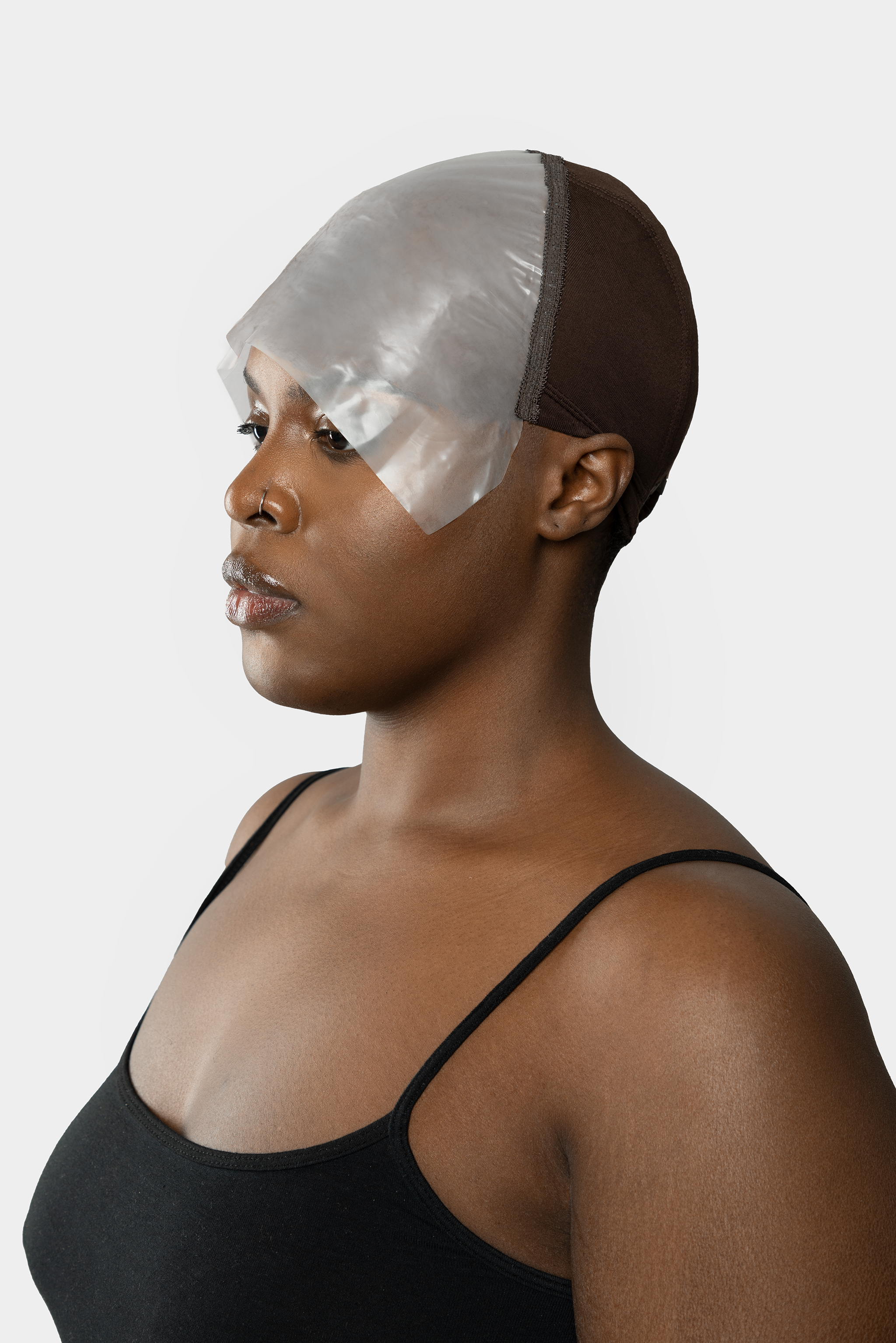 3. Place the cap on your head, positioning the faux-skin material where you want your hairline to appear. Do not apply directly on the hairline.